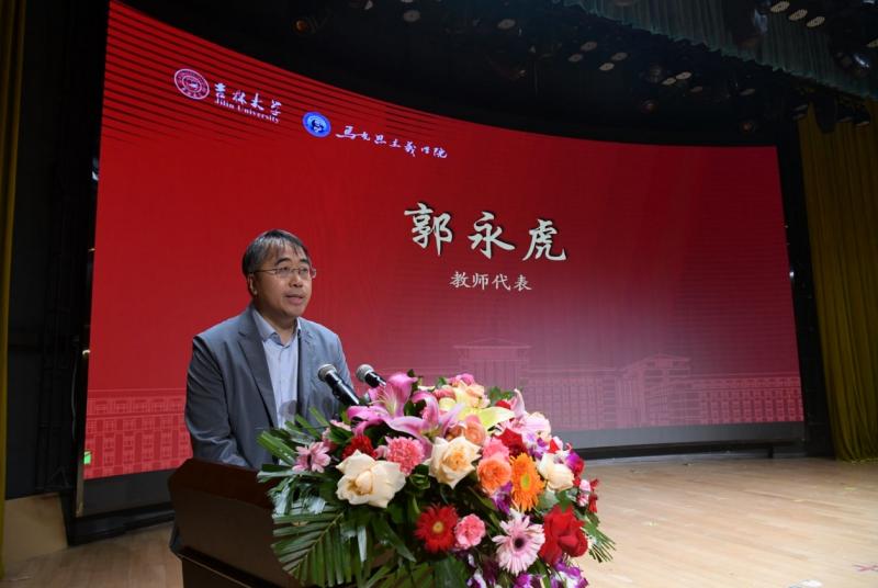 接下来,中共党史党建研究院副院长郭永虎教授作为教师代表上台发言。郭教授紧扣马克思主义者的“定力”“本领”与“勇气”三个关键词,向新生同学们寄予了深切厚望。他期望同学们筑牢对马克思主义的坚定信仰之基,稳稳秉持这份定力;熟练掌握马克思主义理论这一“看家本领”;更要胸怀勇气,笃信自身理想并为之不懈拼搏奋斗。郭教授祝愿大家在未来的学习征途中眼中有光、心中有梦、脚下有路。