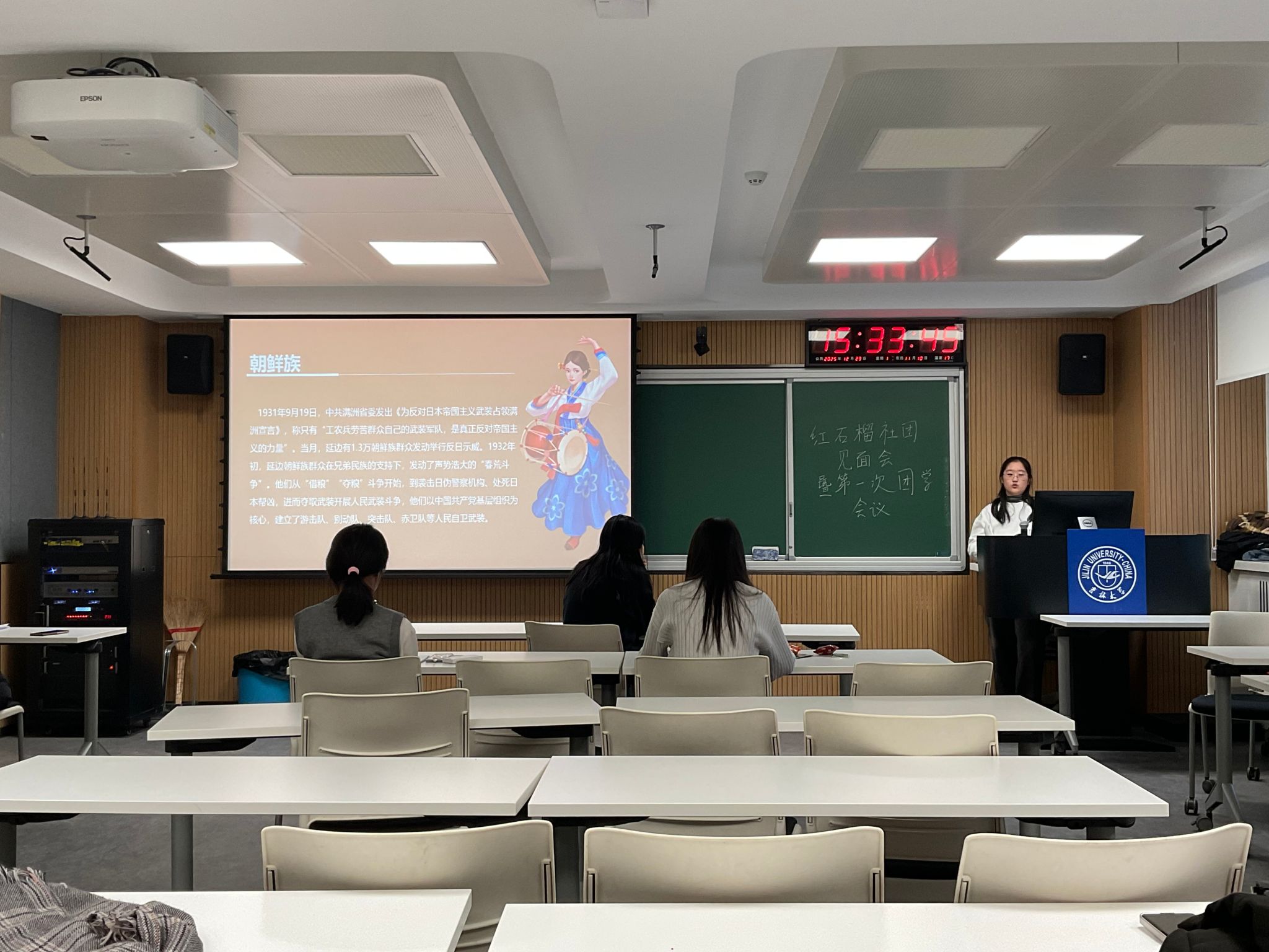 接着,学术部成员卞旭冉以抗日战争与东北少数民族为主题进行分享,从东北民族简介、中国共产党抗日战争期间的民族政策、东北少数民族在抗战中的贡献以及经验与启示等四个方面具体阐述。东北地区农耕与渔猎文明交汇,红山文化见证中华文明曙光,形成多民族共生格局。在抗日战争过程中,朝鲜族、满族、蒙古族参与其中发挥关键作用,体现民族团结力量。我们要秉持着“各美其美,美人之美,美美与共,天下大同”的理念,从东北少数民族的抗战历程中汲取团结奋进的力量。作为红石榴社团的一员,我们我们也应将这份团结意识融入日常,在交流中尊重差异,在互助中凝聚共识,以实际行动践行民族团结的誓言,让“美美与共”的理念在新时代绽放出更耀眼的光芒。