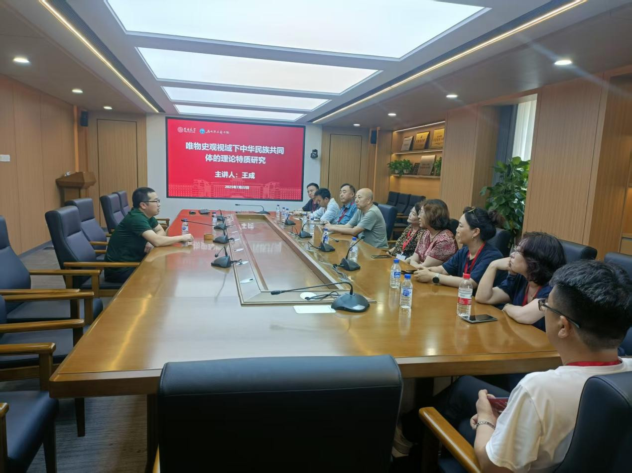 交流活动中,王成老师做了题为《唯物史观视域下中华民族共同体理论特质》的学术报告,分别从坚持正确历史观是理解中华民族共同体的理论前提;唯物史观是共产党人把握历史的科学理论;唯物史观视域下中华民共同体的实体性和建构性、生成性和塑造性等方面进行理论讲解,讲座过程中老师们就相关理论问题进行了充分的研讨。