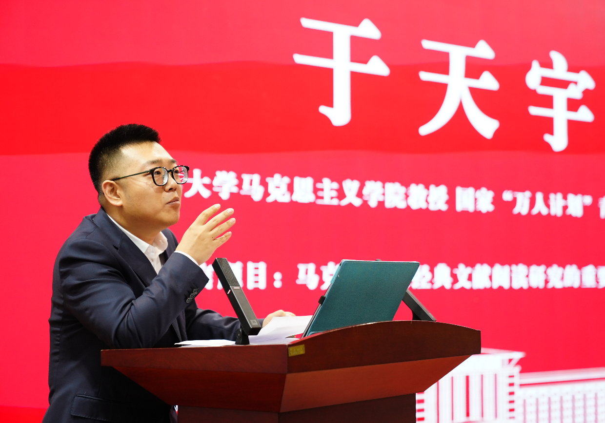 于天宇教授以“马克思主义经典文献阅读研究的重要性及方法”为核心议题,结合自身的学术积淀与研究经验,系统阐释了经典文献研究的基础性意义。于天宇教授指出,对经典文献的研读不能浅尝辄止,要学会通过与经典文本的深度对话体悟马克思主义理论的“灵魂”。他特别强调,学术研究中必须实现通读与精读的有机统一,在循序渐进中建立个性化的阅读范式,方能形成兼具深度与创见的学术洞见。于天宇教授的主旨报告为同学们锻炼学术思维、开展学术探索提供了非常有效的科学方法论。