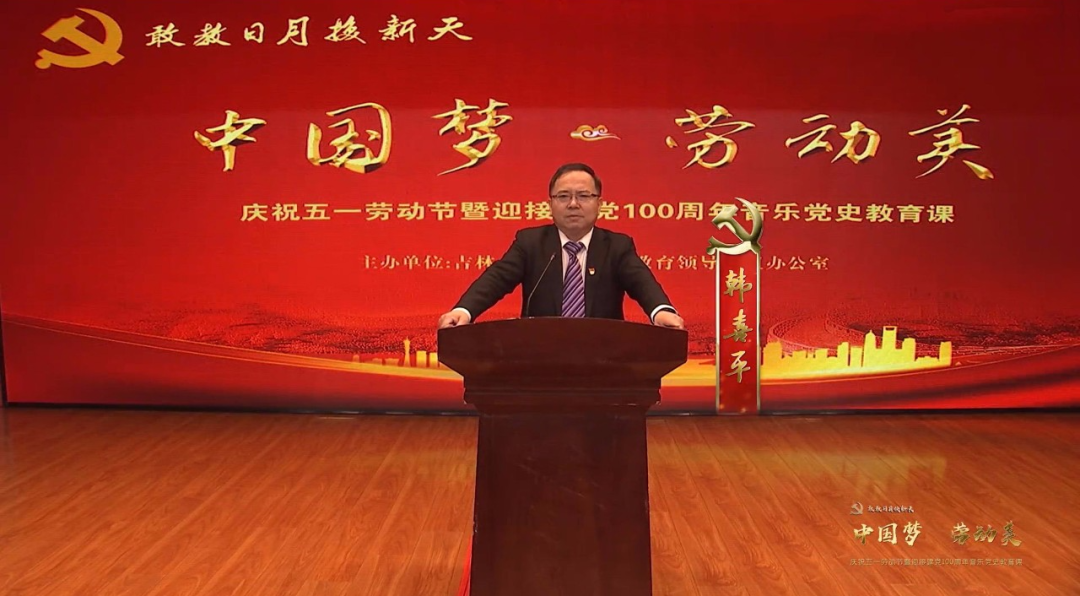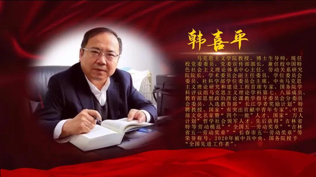 党委宣传部部长、劳动关系研究院院长、全国先进工作者、吉林省特等劳模韩喜平教授主讲,以劳模学者的视角阐释了建党百年的劳动情怀和伟大创造,弘扬了劳动精神、劳模精神和工匠精神。
