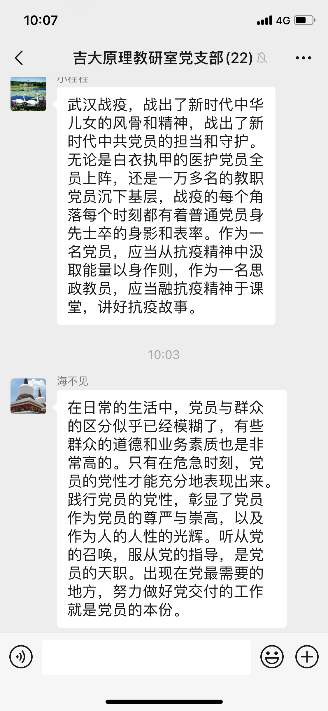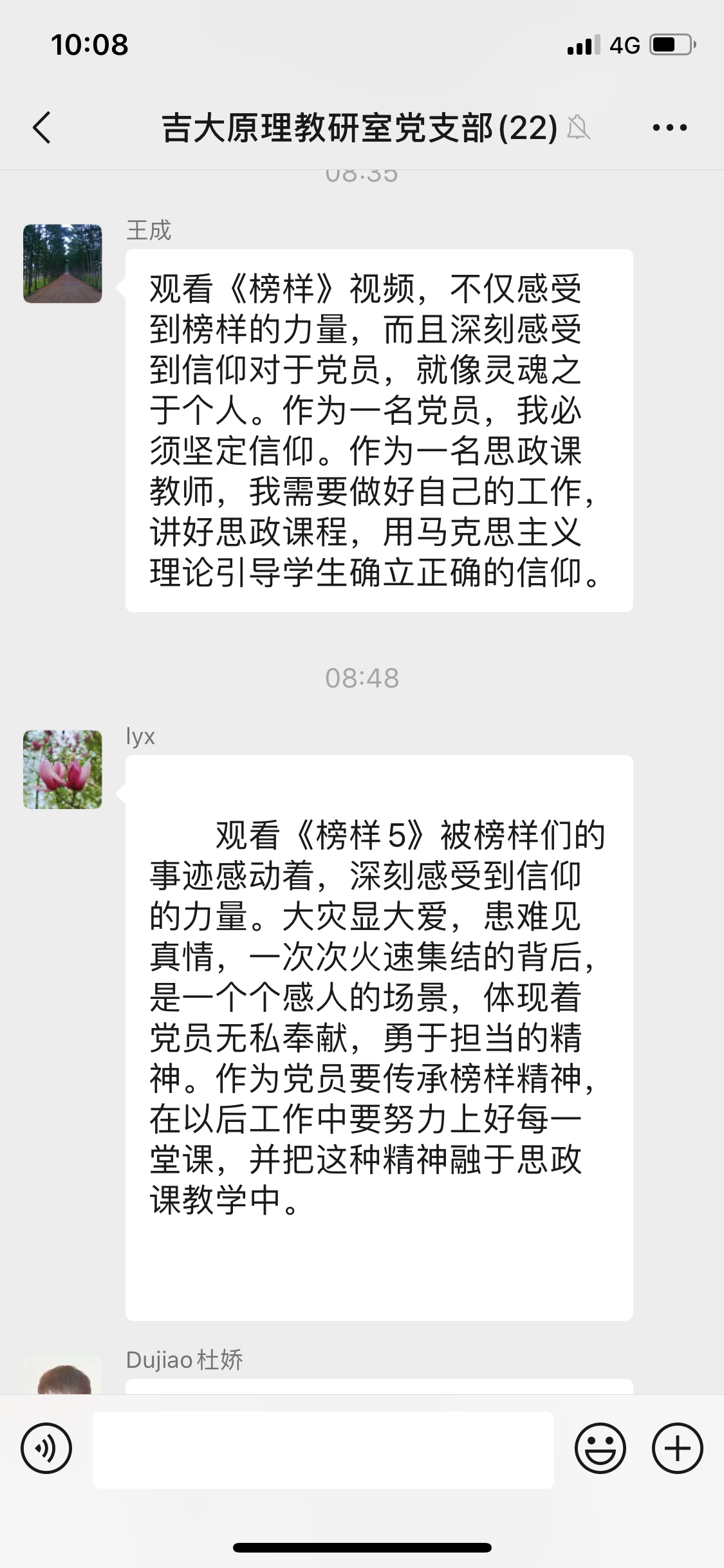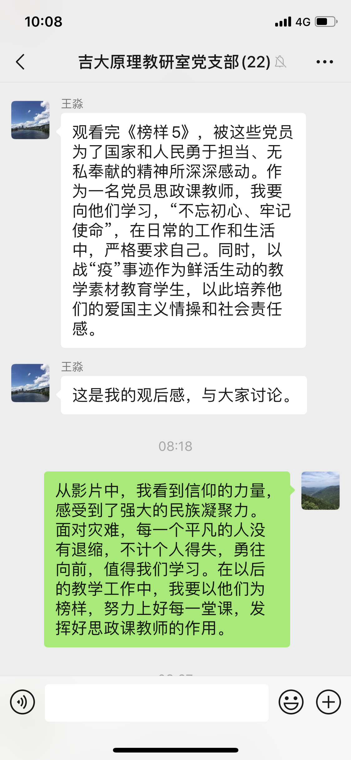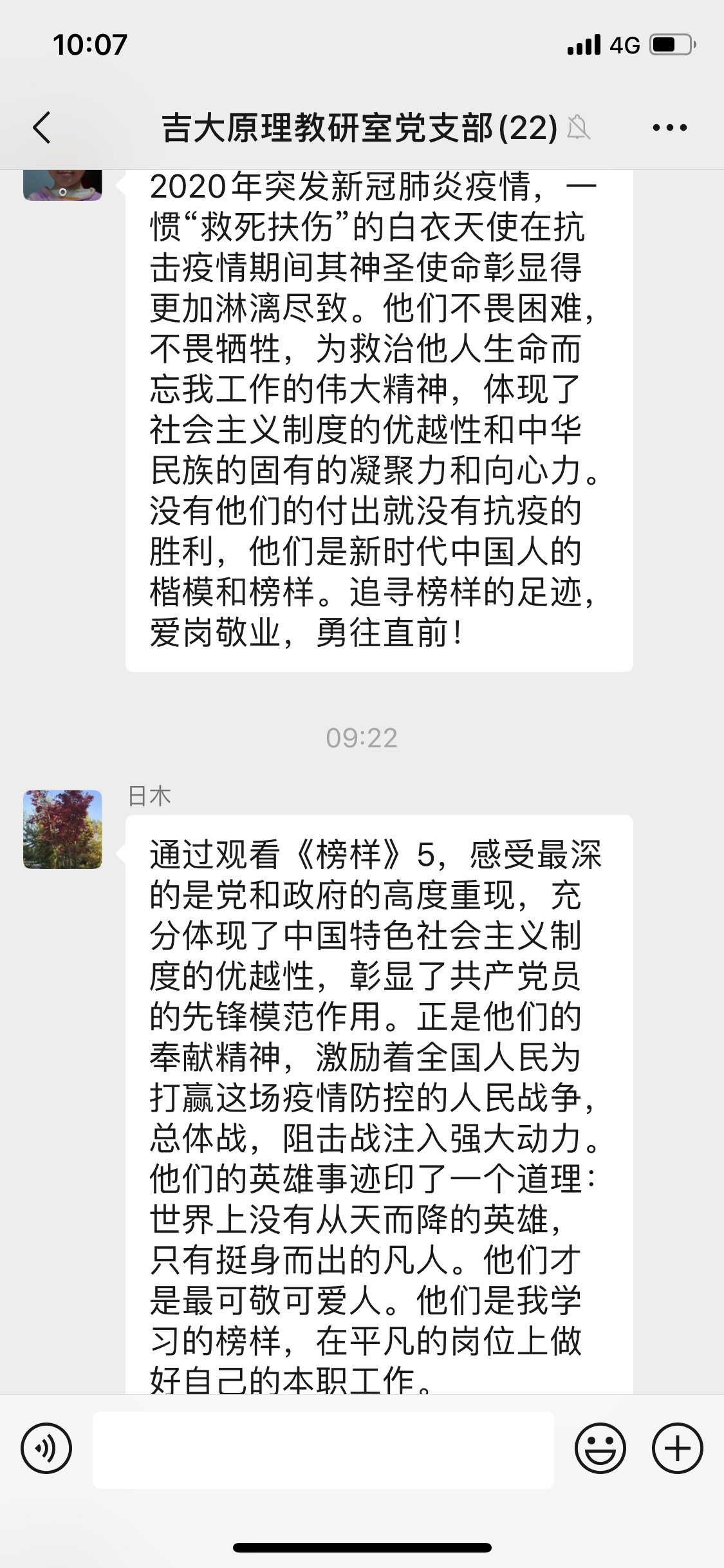党委的号召,把学习榜样的力量与庆祝建党100周年活动紧密结合,于2021年3月29日晚10:00组织收看了《榜样5》专题节目,利用支部微信群举行线上研讨交流会。全体党员在观看节目之后纷纷发表了自己的观后感想。大家一致认为从影片中看到了信仰的力量,深深地感动于这些榜样为了国家和人民的利益勇于担当、无私奉献的精神,而且深刻地感受到信仰对于党员,就像灵魂之于个人。榜样的力量是无穷的,大家也都表示,作为思政课教师,要做好自己本职工作,为新时代中国特色社会主义伟大事业贡献自己的一份力量。