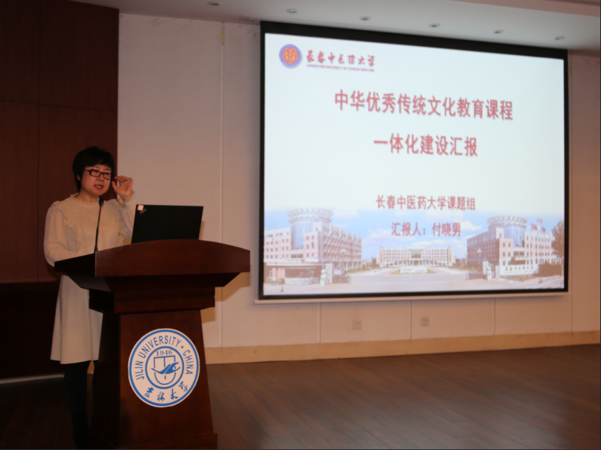 长春中医药大学课题组针对“中华优秀传统文化教育课程一体化建设”进行了成果汇报。她指明《大纲和指南》编写的前提依据是思想政治教育规律和学生认知发展规律;强调《大纲和指南》编写注重的两个主要原则以及主要思路。
