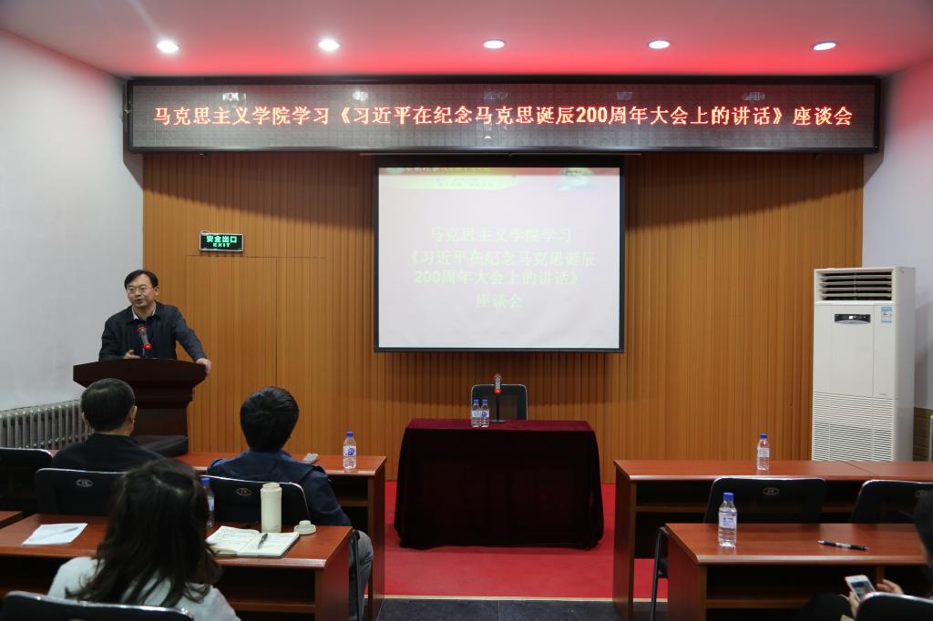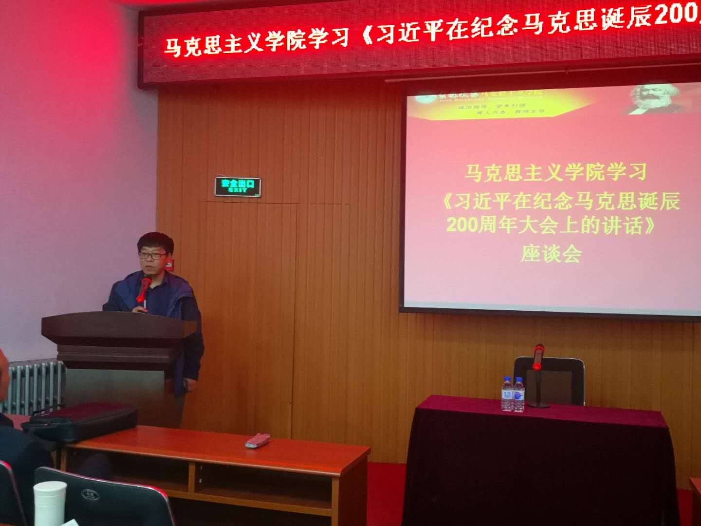 在南区友谊会馆报告厅召开了学习座谈会。会议由吴宏政副院长主持,全体领导班子成员、各学科带头人、教研室党支部书记等60余位教师和行政人员参加了座谈。张敏老师对习近平总书记关于纪念马克思的重大意义进行了分析。仝联勃老师结合习近平总书记的讲话,分析了中国特色社会主义哲学社会科学发展的“理论自觉”和“文化自信”问题。李晔晔老师阐释了马克思主义指导下,中国共产党承担的历史使命。里光年老师对习近平总书记提出的人类命运共同体思想作出了解读。常艳芳老师对马克思的人格魅力与大学精神的关系进行了分析。梁伟峰老师分析了学习马克思主义理论与建构中国特色社会主义哲学社会科学的关系。万佳悦老师谈了学习马克思主义理论与成人抖音