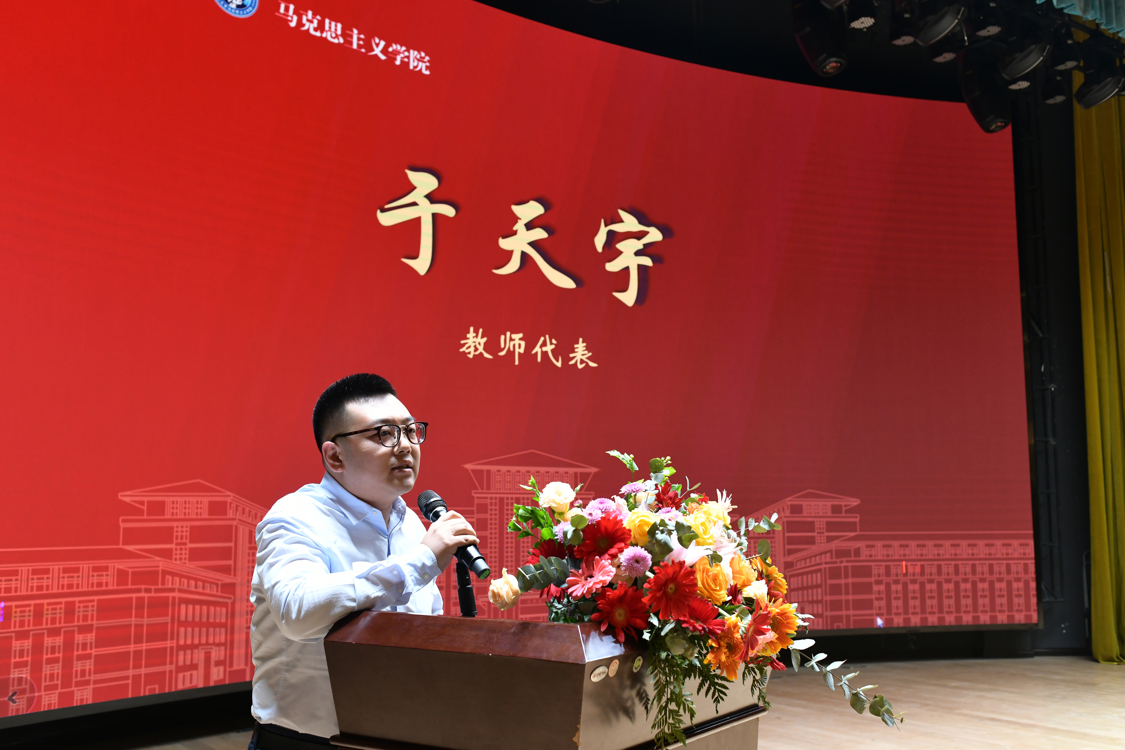 教师代表发言。于天宇向新生同学提出了三点殷切嘱托:珍惜时间、热爱生活、努力学习。希望同学们可以通过成人抖音