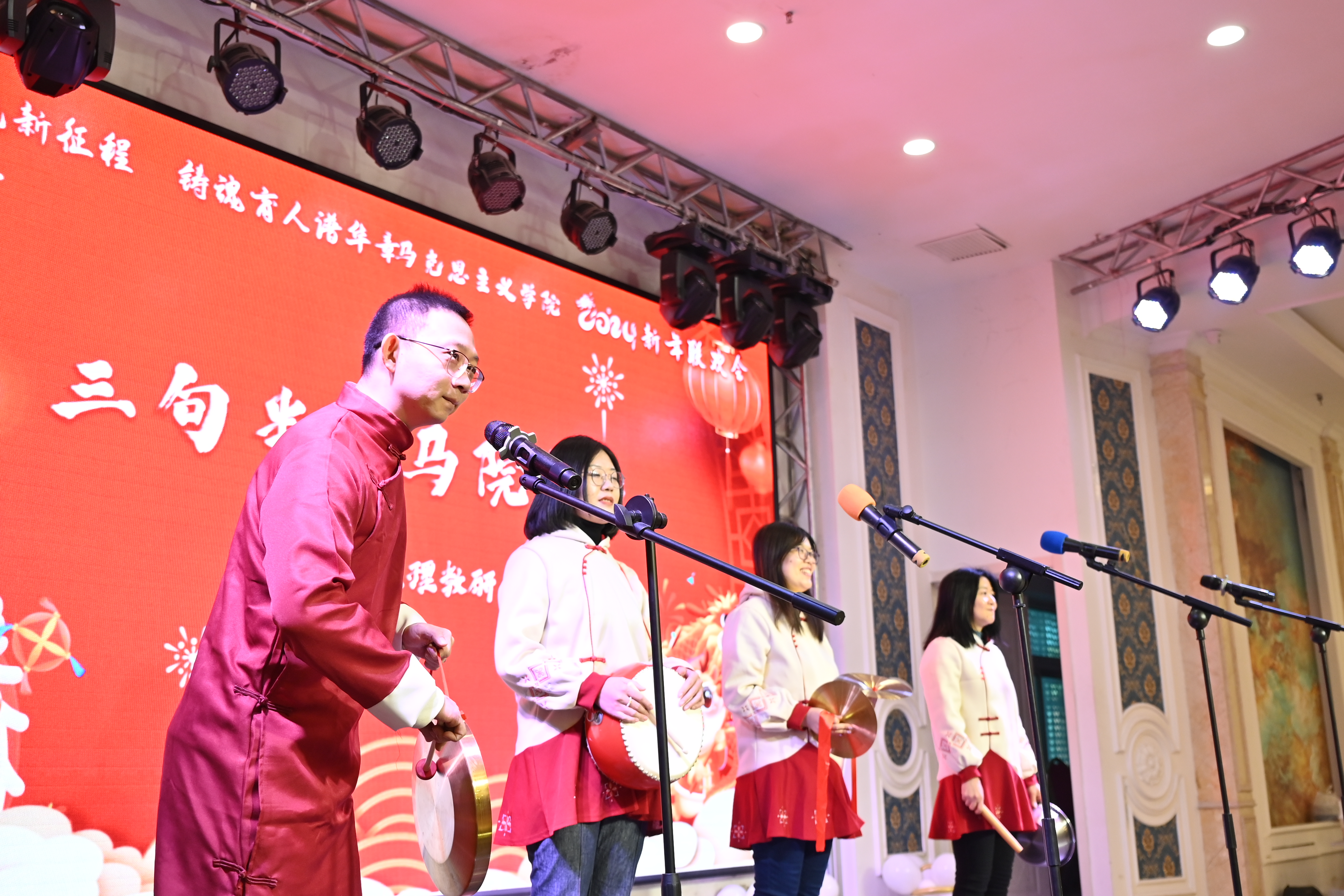 联欢会在形势与政策教研室带来的《相逢是首歌》中正式拉开帷幕,悠扬绵长的曲调和细腻动情的演绎徐徐讲述着奋斗与传承的初心使命;马克思主义基本原理教研室的老师们带来了精彩绝伦的三句半《成人抖音