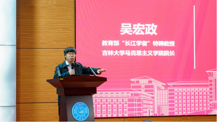 接下来,由吴宏政院长作大会主题报告。吴院长首先高度评价了同学们的研究热情和投稿论文,充分肯定了大家在马克思主义经典研究中的努力。随后,吴院长结合自己阅读经典文献的经验,分享了对马克思恩格斯经典著作的深入理解,围绕着资本主义为何被批判为“丛林法则”这一主题展开详细分析。他通过《1844年经济学哲学手稿》《关于费尔巴哈的提纲》《共产党宣言》等经典文献,详尽推理和论证了马克思主义的核心观点,指出马克思主义的使命是为人类立法,确立公有制的法则。最后,吴院长引用《哥达纲领批判》一文中关于共产主义高级阶段的经典论述作为总结,启发大家进一步思考经典的深刻内涵。