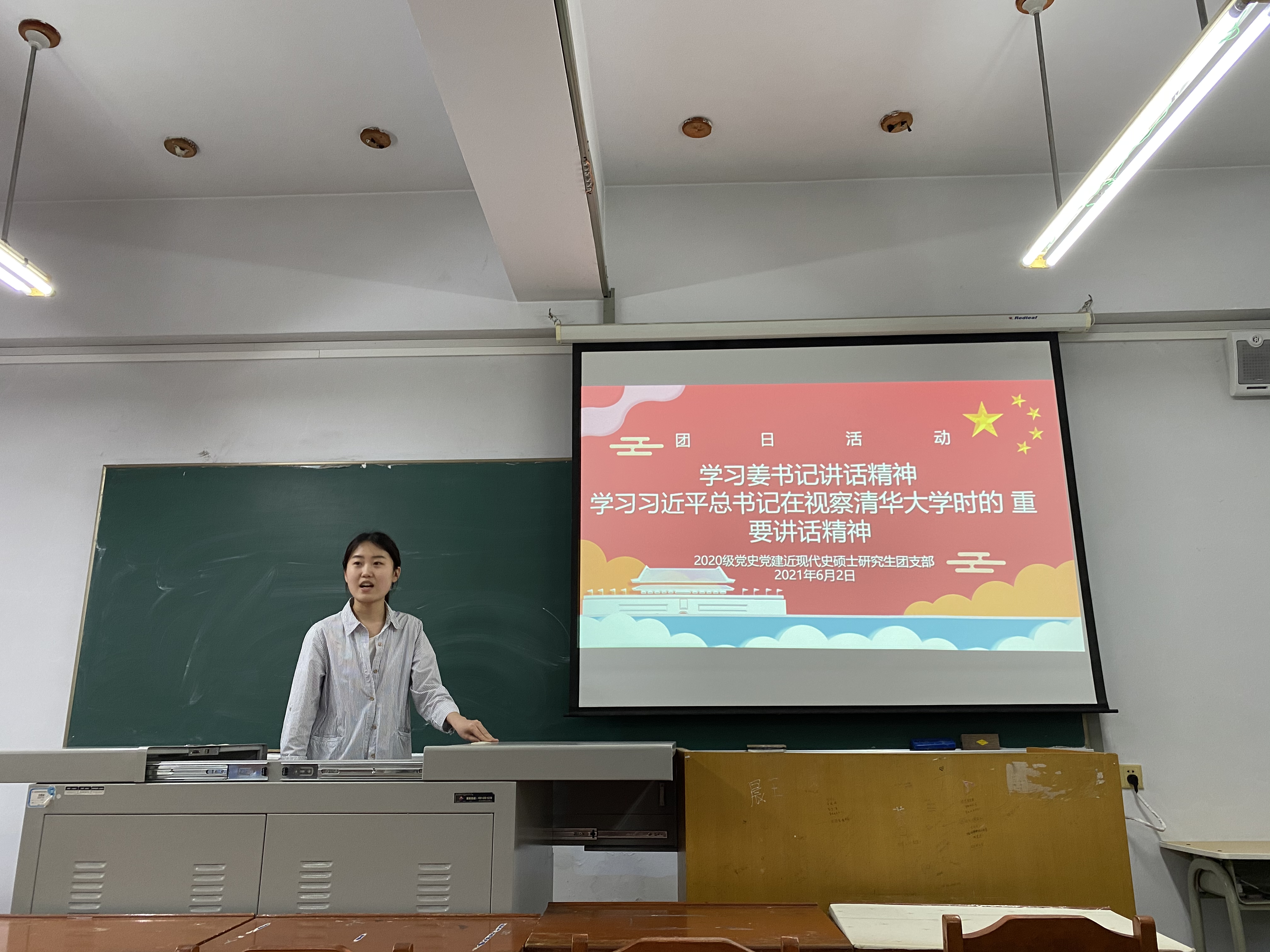 2020级硕士党史党建近现代史团支部召开主题团日活动,领会习近平总书记在视察清华大学时的重要讲话精神,学习校党委书记姜治莹主讲研究生党史学习教育专题党课内容。支部全体成员参加了此次活动。