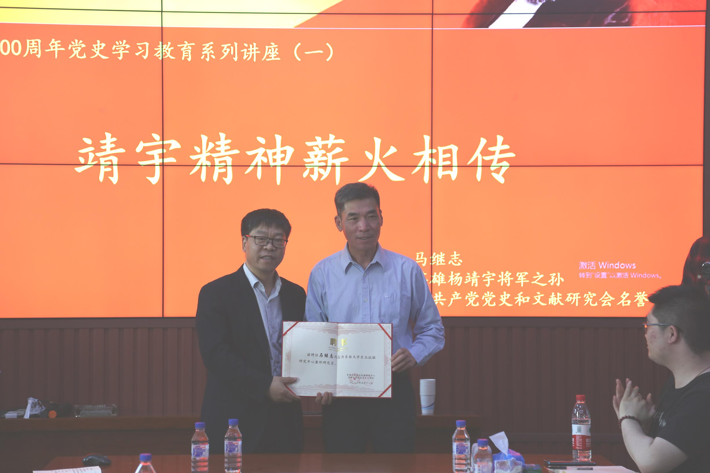 和东北抗联研究中心聘任马继志老师为兼职研究员。在总结点评时,吴院长指出,这是一场特别的讲座,杨靖宇将军后人第一视角的讲述,使我们能够更为真切地触及历史,更为深切地感受和领悟以杨靖宇将军为优秀代表的伟大抗联精神。他勉励大家深刻学习领会讲座内容,继承先烈遗志,以实际行动传承东北抗联精神。