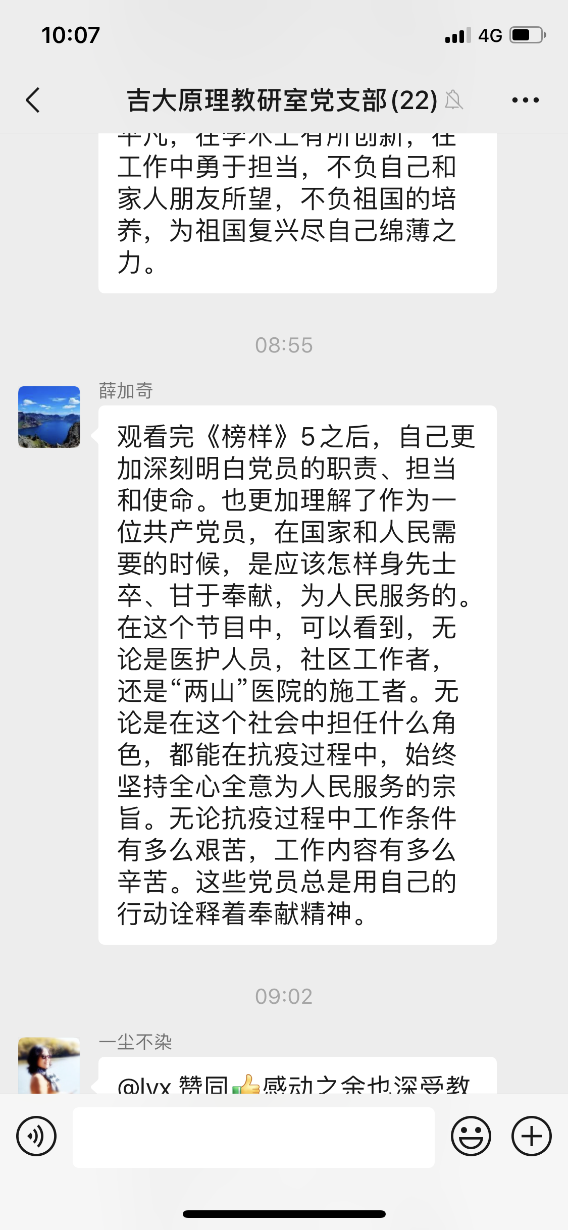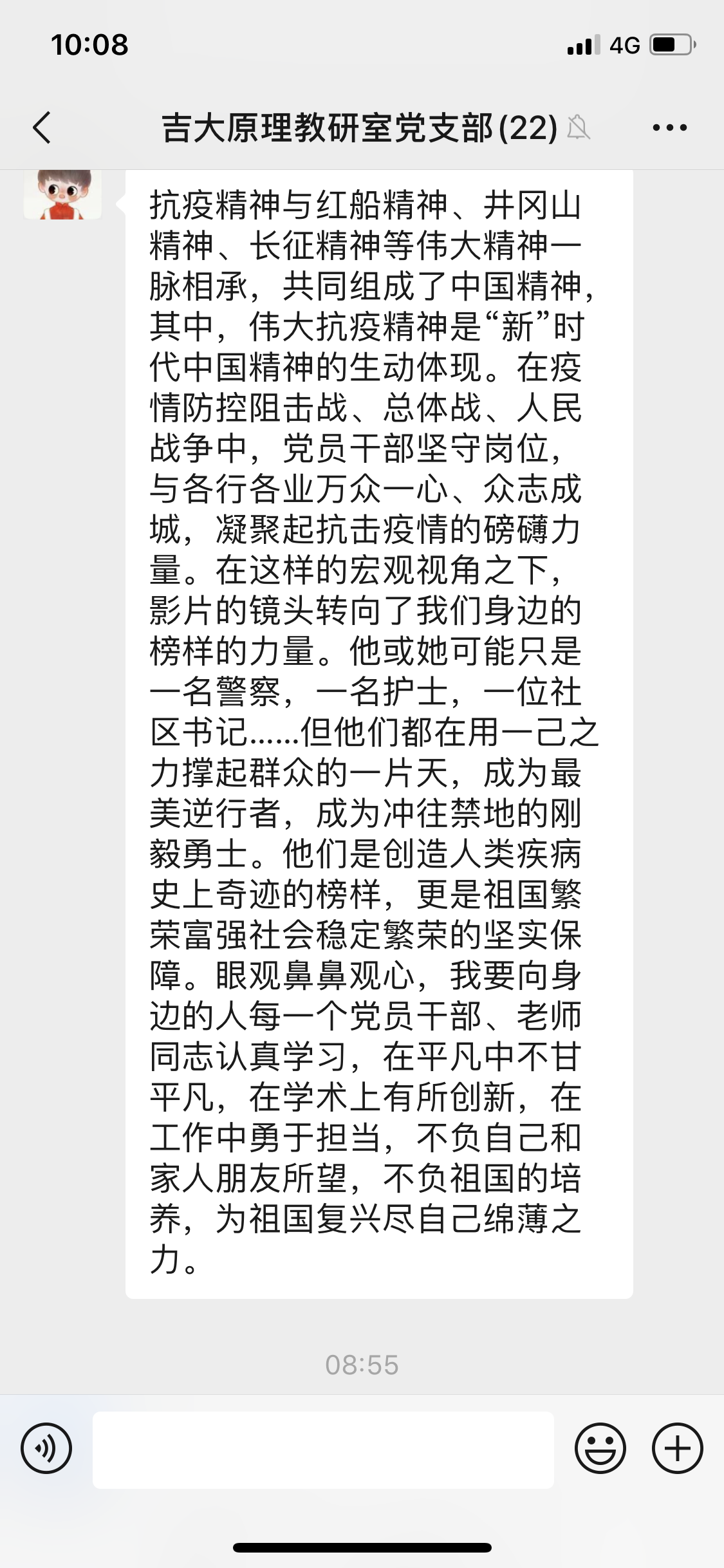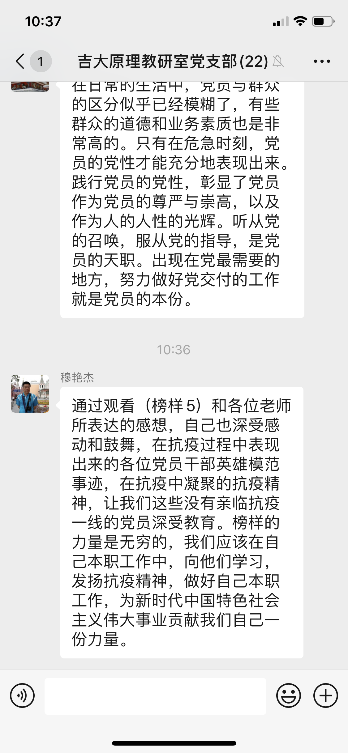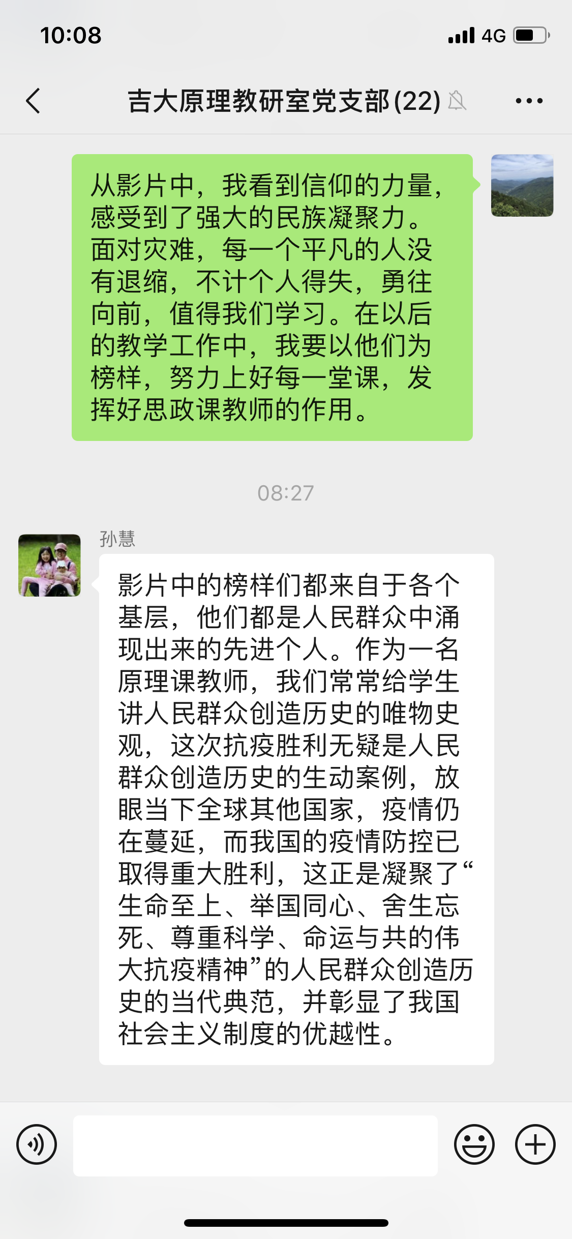 党委的号召,把学习榜样的力量与庆祝建党100周年活动紧密结合,于2021年3月29日晚10:00组织收看了《榜样5》专题节目,利用支部微信群举行线上研讨交流会。全体党员在观看节目之后纷纷发表了自己的观后感想。大家一致认为从影片中看到了信仰的力量,深深地感动于这些榜样为了国家和人民的利益勇于担当、无私奉献的精神,而且深刻地感受到信仰对于党员,就像灵魂之于个人。榜样的力量是无穷的,大家也都表示,作为思政课教师,要做好自己本职工作,为新时代中国特色社会主义伟大事业贡献自己的一份力量。