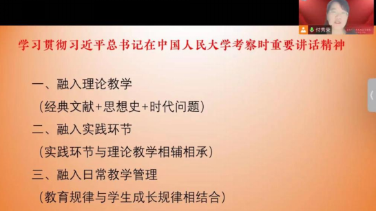 会议伊始,先由本科生教研室付秀荣、姜楠、王勇三位老师就习近平总书记重要讲话精神进课堂进行讲解发言。付秀荣老师指出要从理论教学、实践环节、日常教学管理三个方面,深入推进习近平总书记重要讲话精神真正融入教学。付老师也将日常教学管理工作和成人抖音