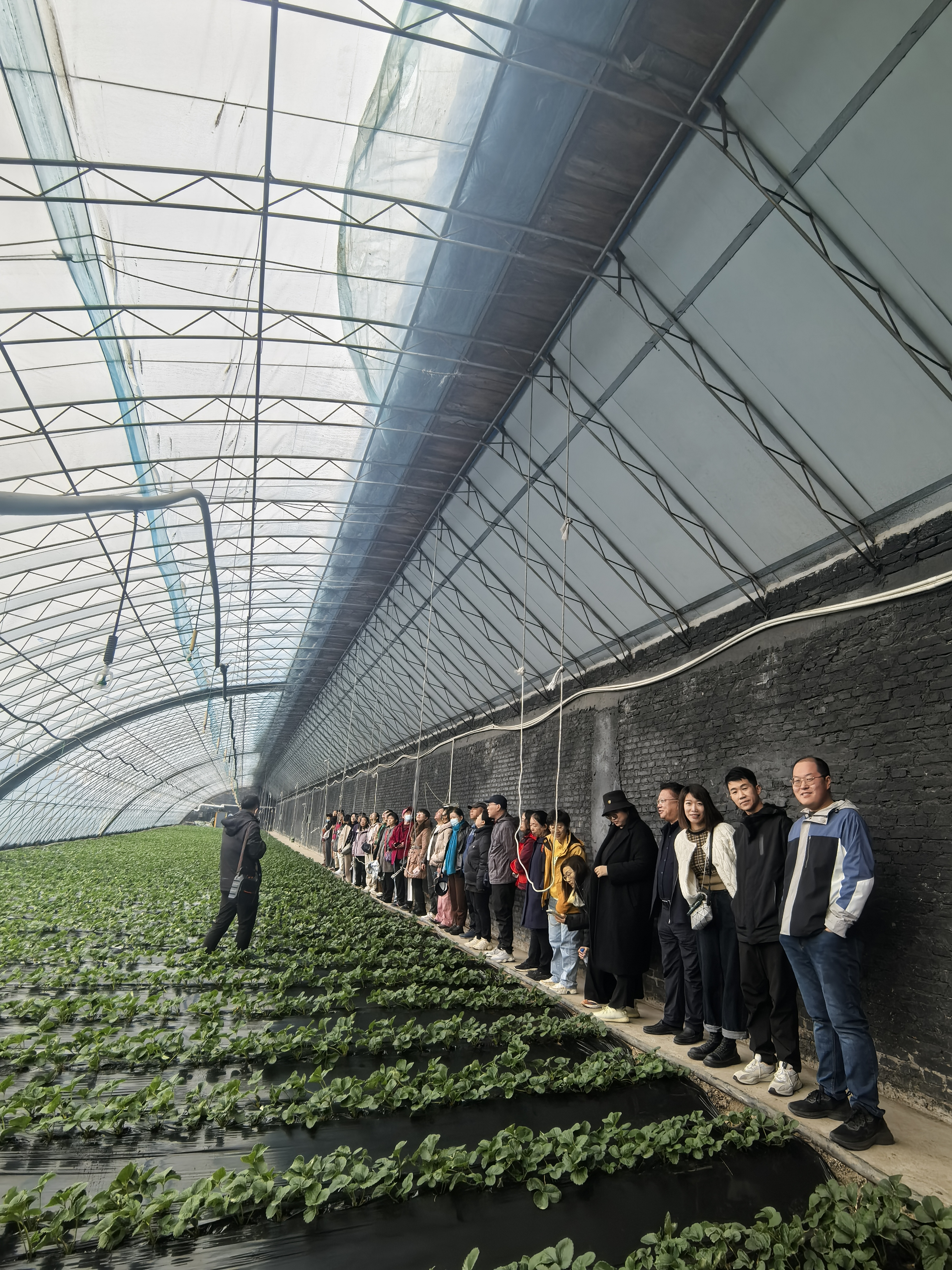 一行人在基地负责人陪同下,参观了陈家店1期智能温室、草莓大棚和嘉和社区。室外是晚秋的萧瑟景象,智能温室中南方的各种植物生机盎然,有金琥、棕榈、圆叶蒲葵、柊叶等植物和木瓜、香蕉、火龙果等热带水果,让人仿佛置身在海南。草莓大棚中幼苗正在蓬勃生长,虽然刚刚10公分高,1月份就到了采摘的时节。嘉和社区拥有1600平方米的一站式服务大厅,内设农家书屋、卫生室、银行、餐厅、会议室、调解室以及便民服务台等,服务功能齐全,成为陈家店村主要的办公议事中心和村民集体活动中心。